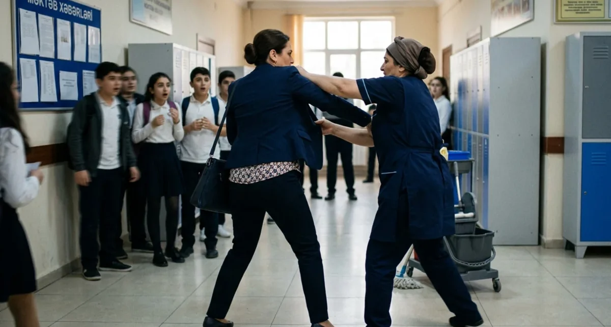Belə ki, orta məktəbin direktoru Aliyə Əliyeva məktəbdə xadimə və qazançı işləyən Ülviyyə Abdullayevanı vəzifələrinin birindən azad edib. O bildirib ki, Ü.Abdullayeva xadimə işlədiyi üçün qazançı vəzifəsində çalışa bilməz. Məsələdən xəbər tutan Ü.Abdullayeva direktorun otağına gələrək, onu söyüb. Daha sonra xadimə ilə direktor arasında mübahisə yaranıb. Mübahisə davaya çevrilib, xadimə direktorun stolunun üstündə olan suveniri qırıb.