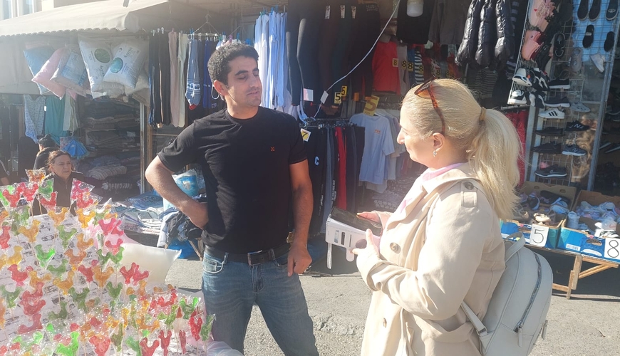 xeberde.az əməkdaşı olaraq həmin stendə yaxınlaşır, satıcı ilə söhbətləşirik.